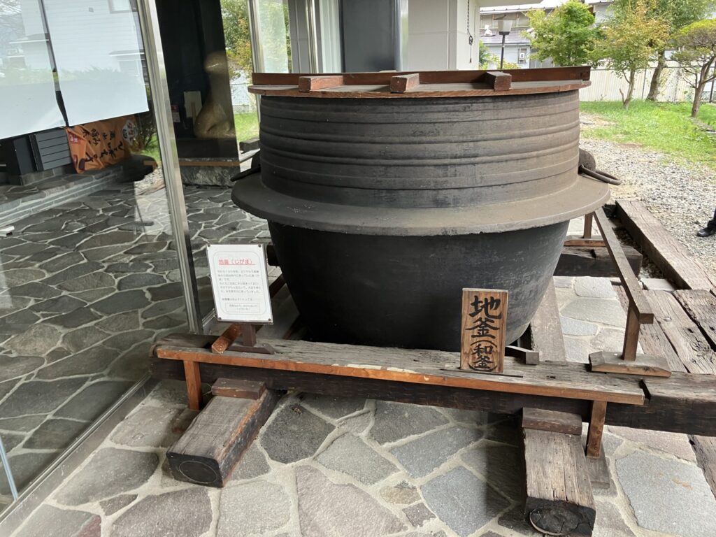 会館の入口には地釜がドンッ!と置いてあります。タケヤみそさんが創業時から使っていた釜で、130年前のもの。重さはおよそ1トンだそうです。